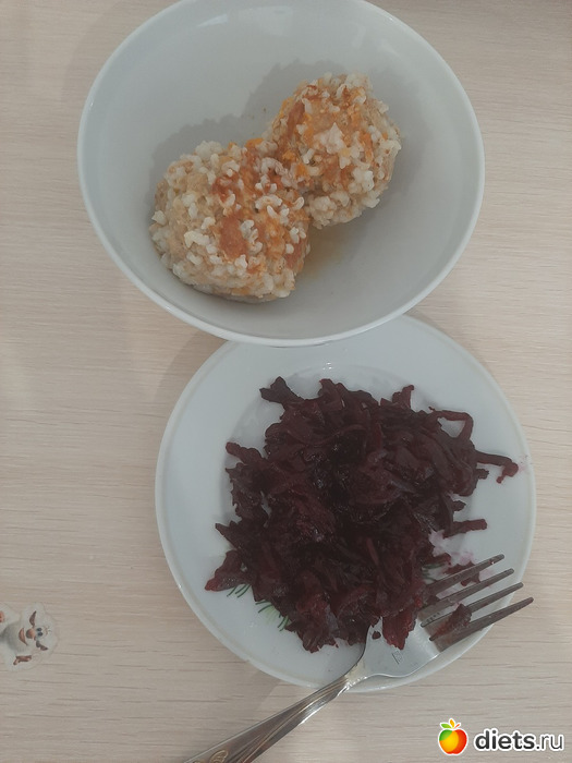 Мой обед: ёжики с рисом из свинины (273 гр), салат из отварной свеклы (100 гр) с подсолнечным маслом (7 гр) и черный чай с 1 ложкой сахара.