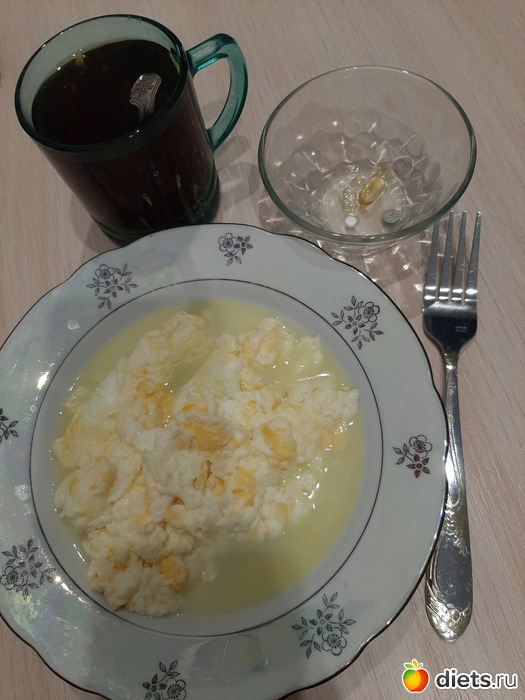 Мой завтрак: яичница с молоком (223 гр) и черный чай с 1 ложкой сахара.