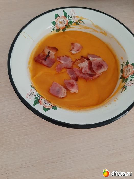 Мой обед: тыквенный суп-пюре (220 гр), жареный на сухой сковороде бекон (9 гр) и черный чай с 1 ложкой сахара.