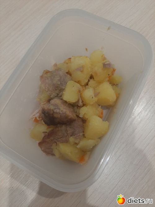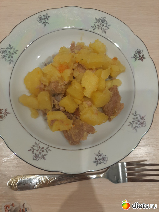 Мой обед: картофель тушеный со свининой (198 гр) и вода.