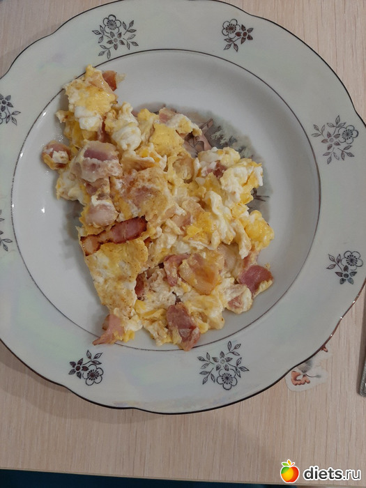 Мой завтрак: яичница с беконом (123 гр) и черный чай с 1 ложкой сахара.