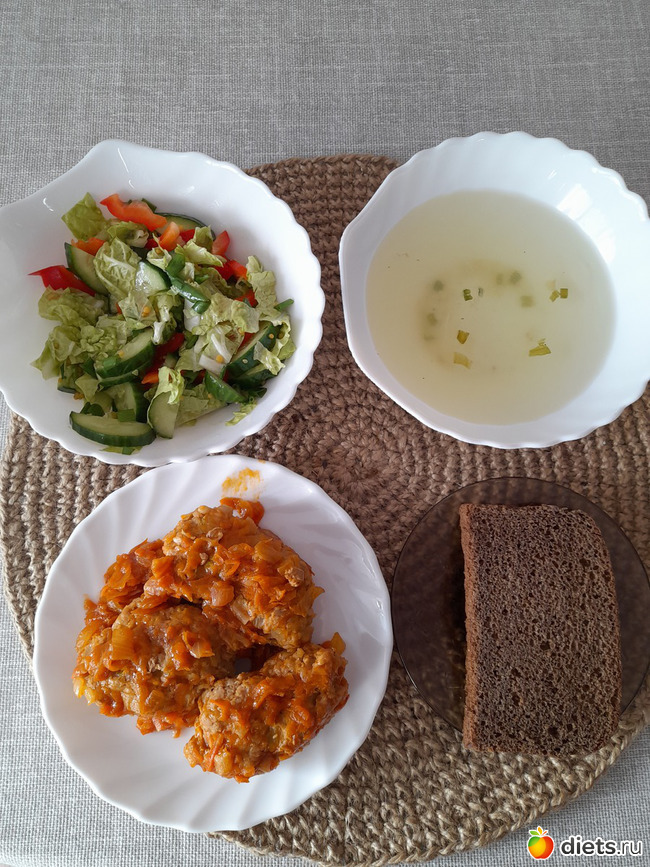 Обед: Ленивые голубцы (без риса) + салат + бульон + кусочек хлеба.