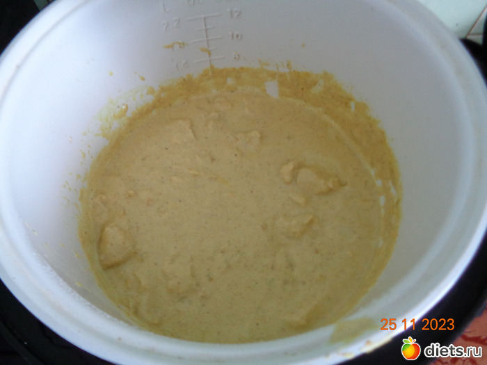 6. Посолить, поперчить, добавить карри, перемешать. Выбрать режим "Тушение", установить таймер на 1 час. Готовое блюдо посыпать рубленой зеленью.