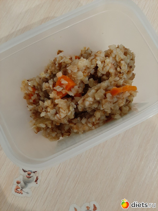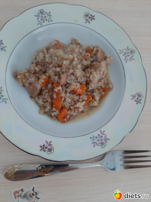 Мой обед: гречка с мясом и морковью (204 гр) и черный чай с 1 ложкой сахара.