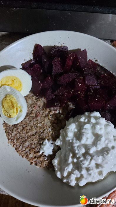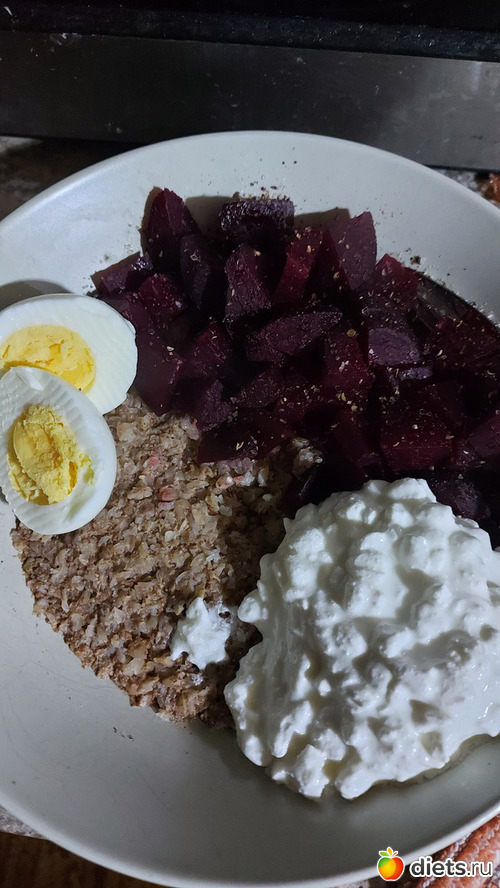 По сути, гречка+вареное яйцо+зерновой творог+вареная запеченая свекла. Еще по рецепту айсберг, но он уже совсем ни в какие ворота не лез
