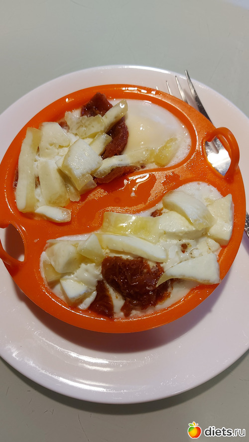 На завтрак сделала омлетокексы в яйцеварке. Гонять духовку ради 2-х кексов дорого и долго.. Сыр положила творожный, надо было докончить.