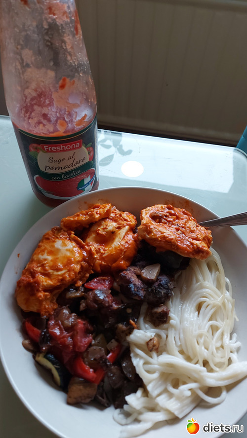 На обед жарила курфиле с овощами, которые нашлись под рукой, не обязательно из меню: чеснок, красный лук, цуккини, баклажан, перец, помидор. Соль, перец, базилик. Показалось пресновато. Добавила в спагетти томатный соус, но не рекомендованый автором, он мне не очень понравился, а острый польский. Поела не оч вкусно. Зато на ужин вчерашняя вкусняшка, правда кугель это блюдо, которое лучше готовить на 1 раз. На второй день высыхает... На полдник было яблоко. Вечером было голодно очень, не удержалась и сьела яйцо и котлету сверх нормы