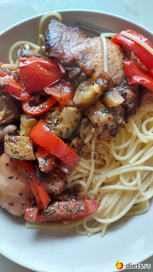 О: спагетти с курицей и жареными овощами