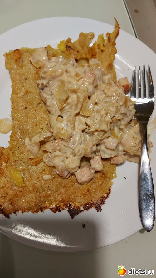 У: кугель с соусом из копченого куриного филе