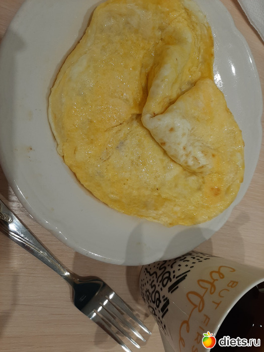 Мой завтрак: омлет из яиц и сливочного масла (102 гр) и черный чай с 1 ложкой сахара.