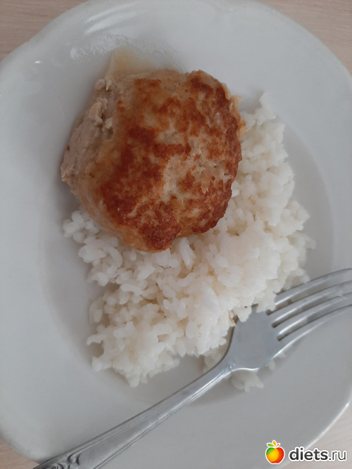 Мой обед: рис отварной (67 гр) со свиной котлетой (95 гр) и вишневый компот (250 гр).