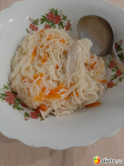 Мой ужин: суп куриный с вермешелью и морковью (235 гр) и черный чай с 1 ложкой сахара.