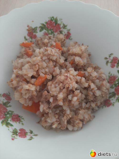 Мой обед: гречка с мясом и морковью (208 гр) с черный чай без сахара.