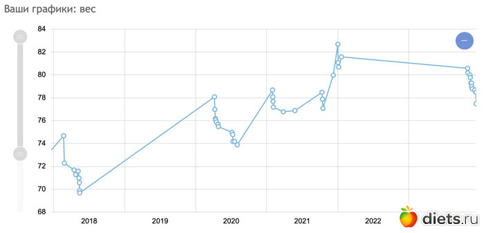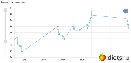 Вот 2019 - Моя тренер по фигурному катанию решила сменить место жительства и уехала из Москвы. Для меня это стало ударом, так как я ее довольно долго искала, занималась у нее года 3, почти сроднилась... Есть много тренеров, которые хорошо детишек учат. А вот тех, кто может корявым и задубевшим взрослым показать и рассказать, как правильно двигаться, - таких еще поискать. Искать нового тренера я была не готова, сама кататься не смогла - это ж не всегда и не везде можно, каток для массового катания еще попробуй найти зимой (когда народу на льду много, не особо потренируешься) и постоянно надо выкраивать время, ехать куда-то... Когда знаешь, что тренер ждет, собираешься и едешь. А когда никто не ждет, обязательства нет... Вобщем, сошло на нет мое увлечение... Стала больше ходить пешком, поменяла работу, новый офис был довольно далеко от метро, ходить пришлось еще больше. Но накопленный с предыдущей работы стресс уже сказался на весе плюс новая работа принесла неприятный сюрприз и обернулась новым стрессом - вес рост как-то очень стремительно. Не сам по себе, конечно, сладкого и мучного в тот период было - страшно вспомнить. По графику веса видно, что за этот год скачок было почти 10 кг: