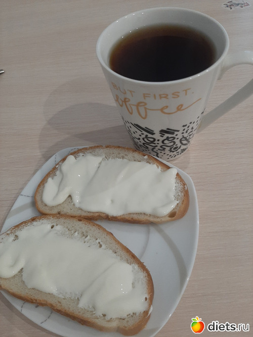 Мой завтрак: хлеб белый (35 гр) с плавленным сыром (31 гр) и черный чай с 1 ложкой сахара.