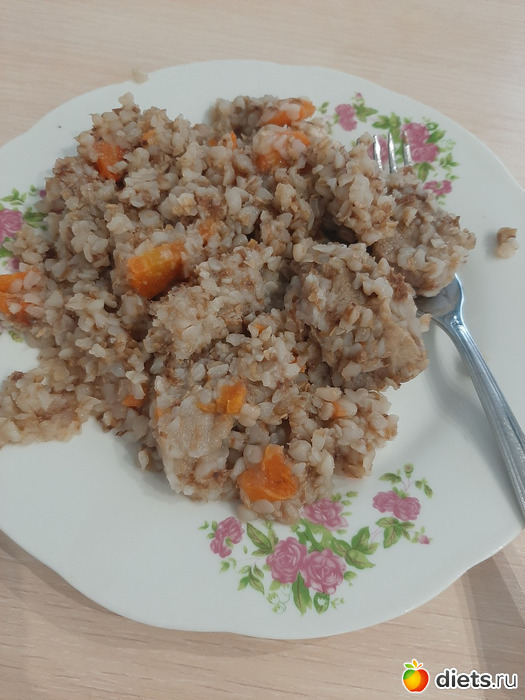 Мой обед: гречка с мясом и морковью (213 гр), помидоры черри (61 гр) и кофе растворимый со сливками и 1 чайной ложкой сахара.