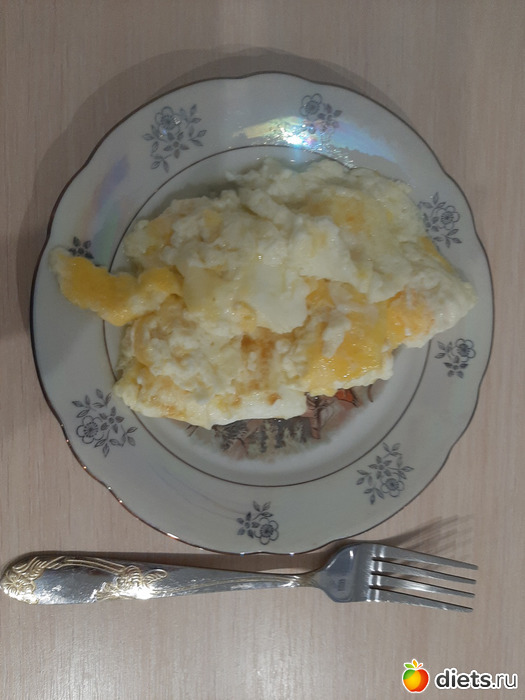 Мой завтрак: яичница с молоком (172 гр), банан (102 гр) и 2 кружки черного чая с сахаром.
