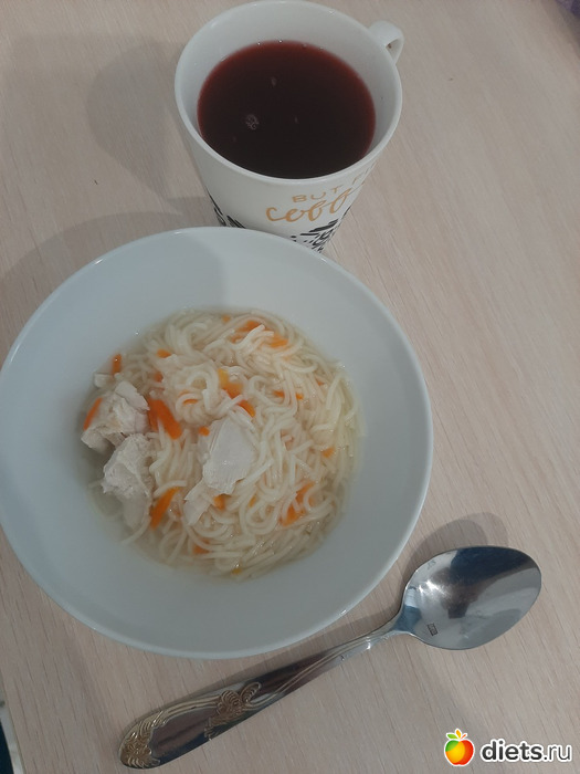 Мой обед: суп куриный с вермешелью (257 гр) и вишневый компот.