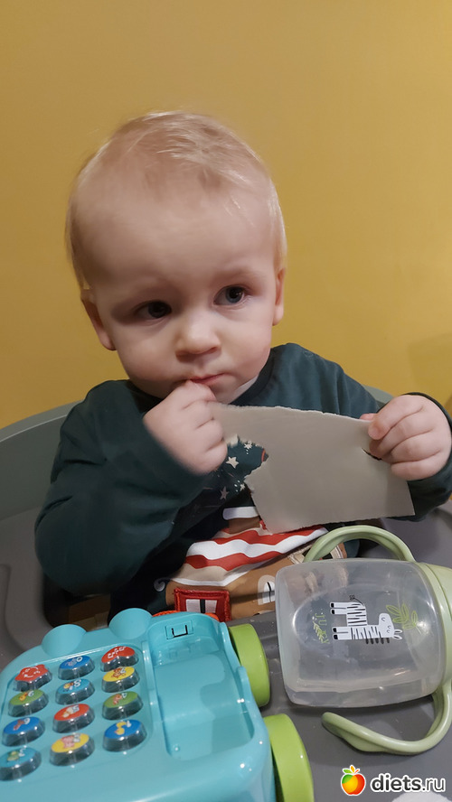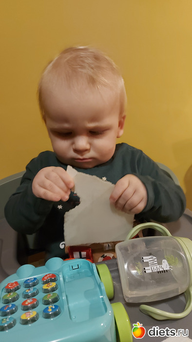 Малышок ест просфору. Ее надо разделить между всеми, кто сидит за столом, отламывая по кусочку. Просфоры мужу выдает на работе священник