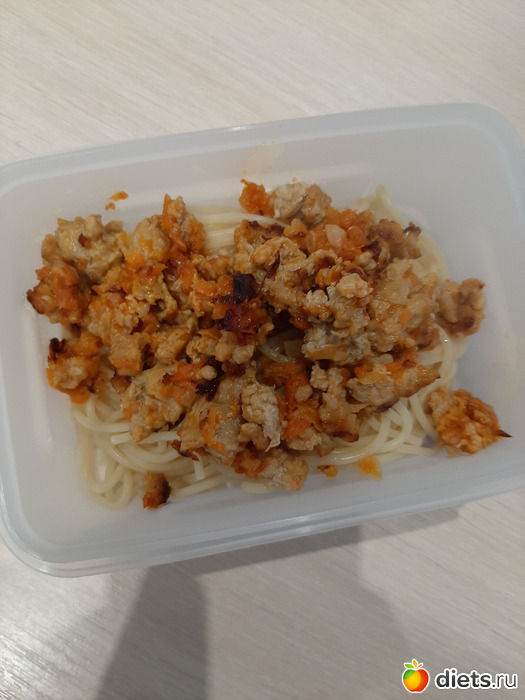 Мой обед: макароны отварные (120 гр) с фаршем (87 гр) и вода.