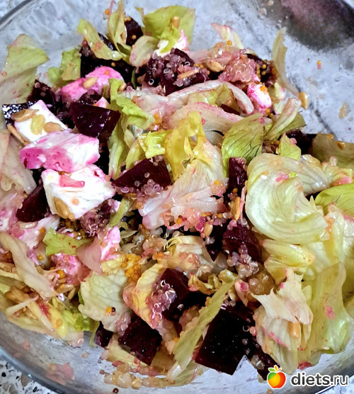 Ингредиенты: отварная свекла, киноа, сыр фета, салат айсберг, семечки (вообще-то тыквенные топчик, но их не было в наличии), французская горчица, оливковое масло.