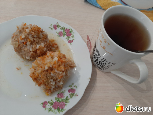 Мой обед: ёжики с рисом из свинины (200 гр) и черный чай с 1 ложкой сахара.