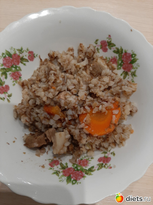Мой ужин: гречка с мясом (217 гр) и 2 кружки черного чая и 2 чайные ложки сахара.