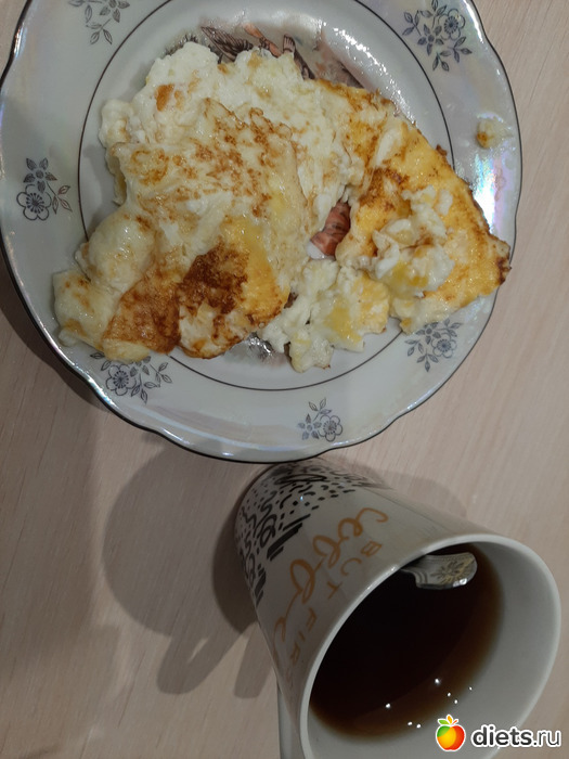 Завтрак: яичница с молоком на сливочном масле (135 гр), белый хлеб (14 гр) с сыром (20 гр) и черный чай с 1 ложкой сахара.
