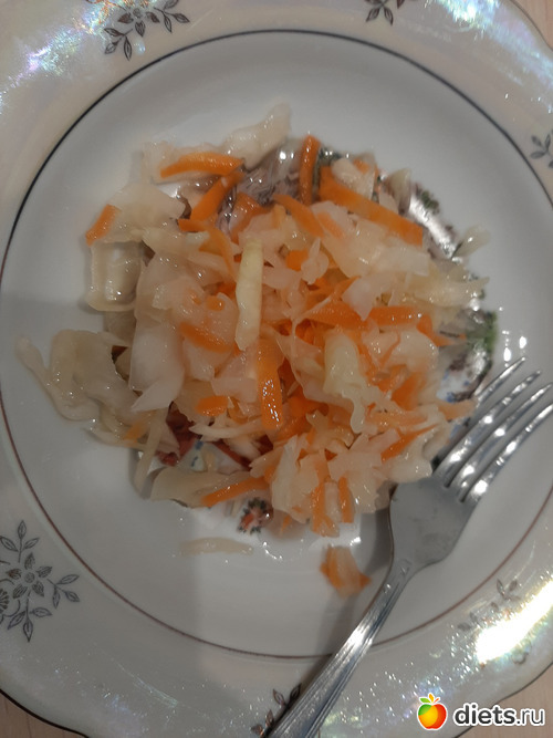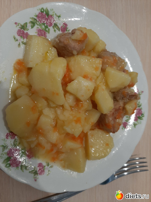 Обед: картофель тушеный со свининой (300 гр), квашеная капуста (80 гр) и черный чай с 1 ложкой сахара.