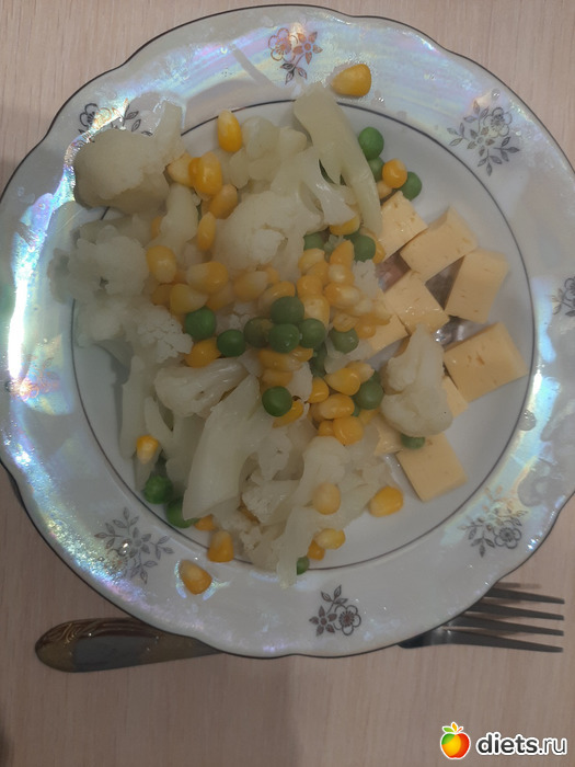 Ужин: отварные овощи: цветная капуста, зеленый горошек, кукуруза (251 гр), сыр (46 гр) и черный чай с 1 ложкой сахара.