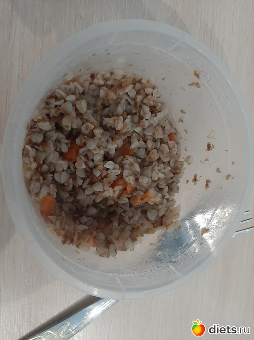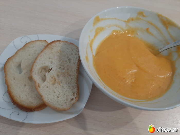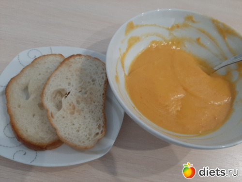 Обед: тыквенный суп-пюре (212 гр), хлеб, поджареный на растительном масле (31 гр), гречка (102 гр) и чай с 1 ложкой сахара.