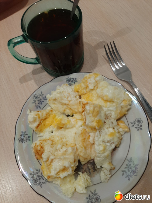 Завтрак: яичница с молоком на сливочном масле (229 гр) и черный чай с 1 ложкой сахара.