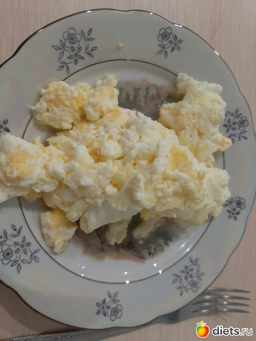Завтрак: яичница с молоком на сливочном масле (202 гр) и черный чай с 1 ложкой сахара.