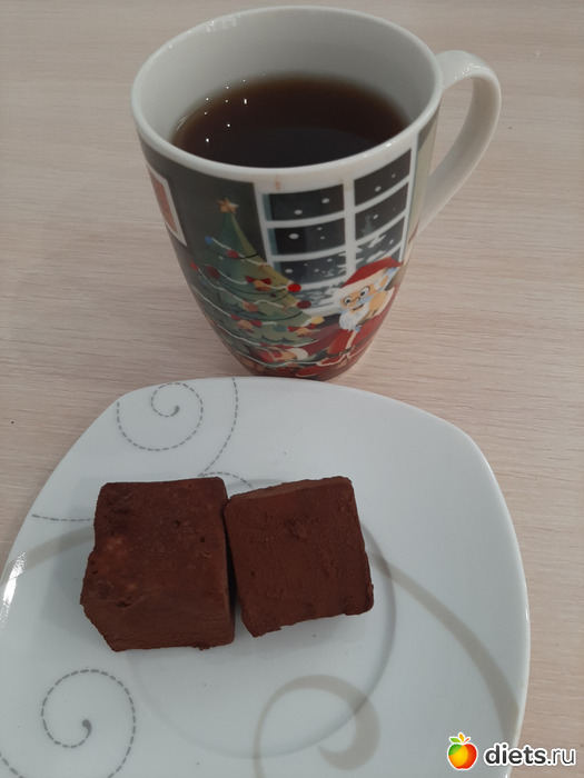 Обед: котлета (98 гр), хлеб белый (37 гр), домашние конфеты Птичье молоко шоколадное (61 гр) и черный чай с 1 ложкой сахара.