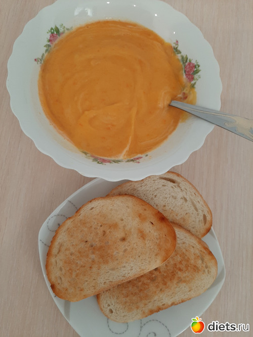 Полдник: тыквенный суп-пюре (309 гр), белый хлеб, поджареных на подсолнечном масле (60 гр) и черный чай с 1 ложкой сахара.