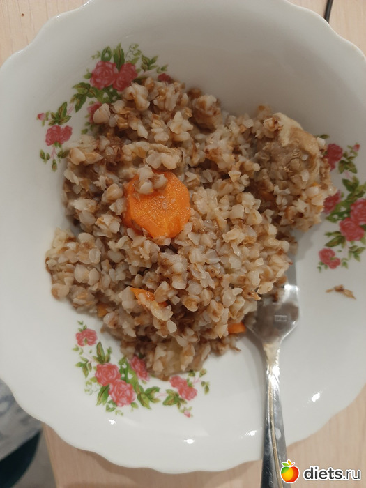 Ужин: гречка с мясом (209 гр) и черный чай с 1 ложкой сахара.