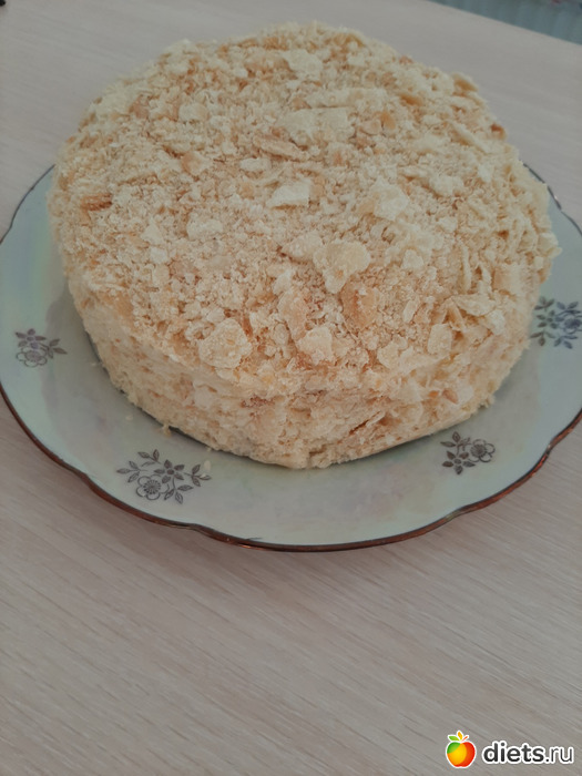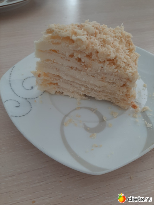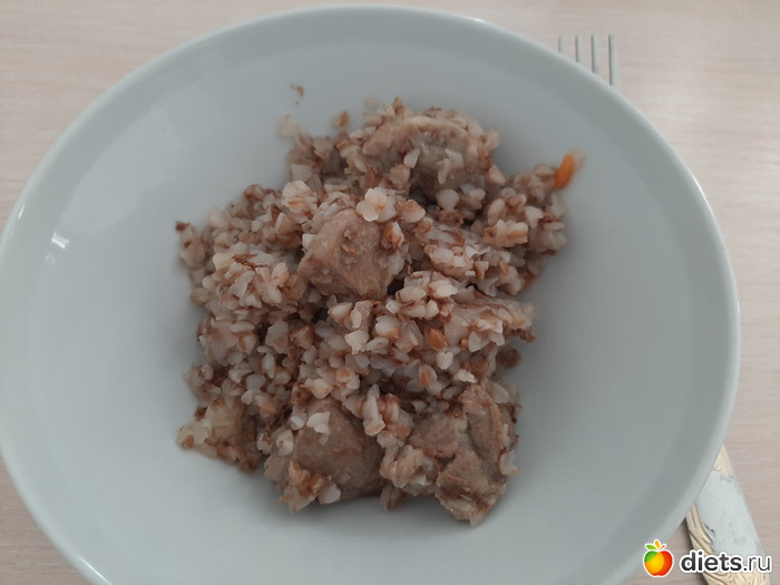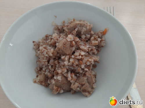 Обед: гречка с мясом и морковкой (200 гр), домашний торт Наполеон (66 гр) и черный чай с 1 ложкой сахара.