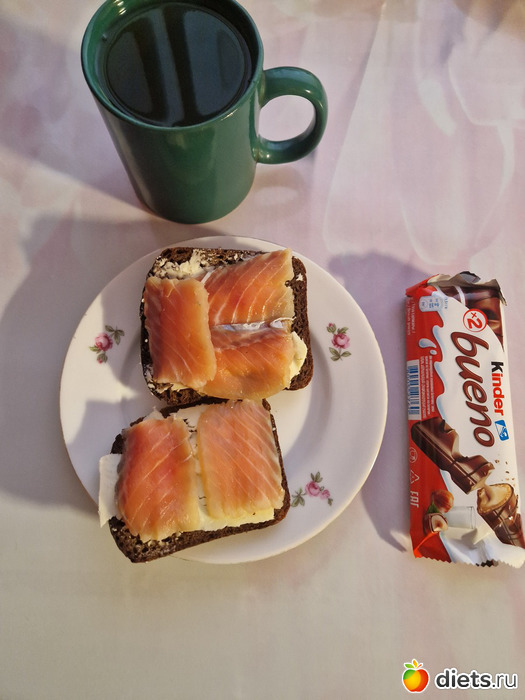 Ржаной хлеб, масло, форель. Чай с шоколадкой.