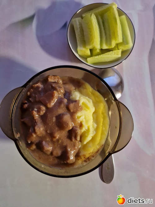 На обед пюрешка с гуляшом и свежий огурчик.