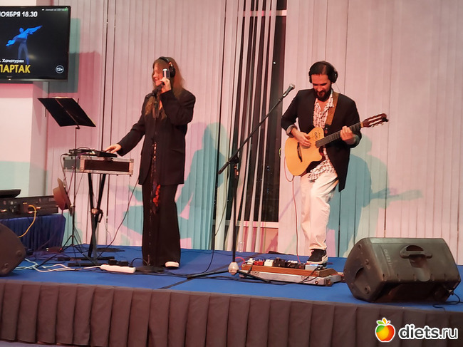 Интересный дуэт, пели и играли под минусовку оркестра, вводя инструменты - маракасы, бубен.