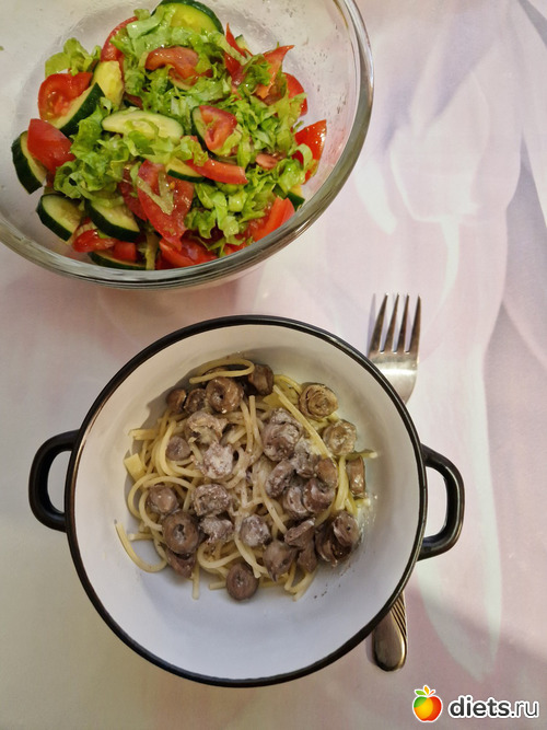 Далее домашние дела, обед. На обед спагетти с сердечками и овощной салатик.