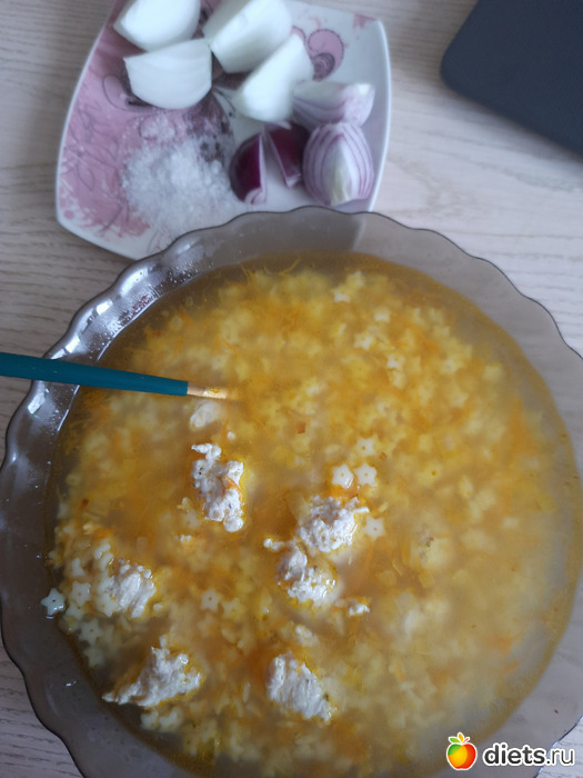 На обед суп с куриными фрикадельками и лапшой, без картошки. Сын не любит картошку, и я спокойно супы без картошки могу есть. Ещу лук от семи недуг