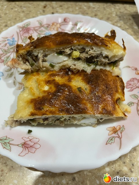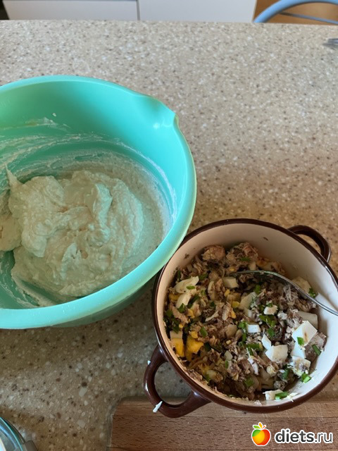 Готовка: творог 0,5, разморож кефир, яйцо, разрыхлитель. Начинка: скумбрия в соб соку, яйцо отварное, белок отварной, лук перо.