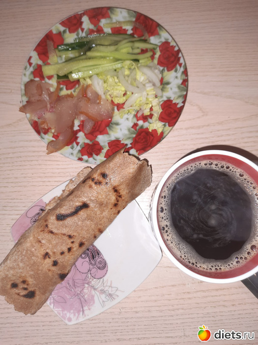Лепешка из цз муки, свернула как шаурму, начинка- пекинка, огурец и карпаччо из курицы. Съела две таких.