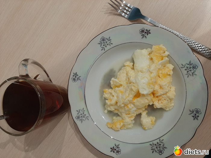 Завтрак: яичница с молоком (169 гр), творожная запеканка с изюмом (124 гр) и черный чай с 1 ложкой сахара.