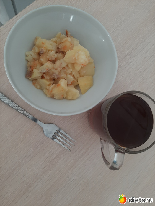 Обед: картофель тушеный со свининой (201 гр) и черный чай с 1 ложкой сахара.