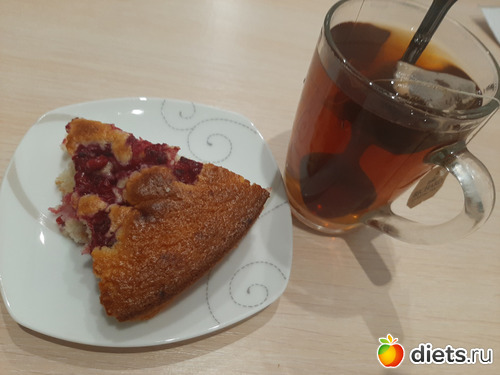 Полдник: половинка яблока (50 гр), манник с красной смородиной (119 гр) и черный чай с 1 ложкой сахара.