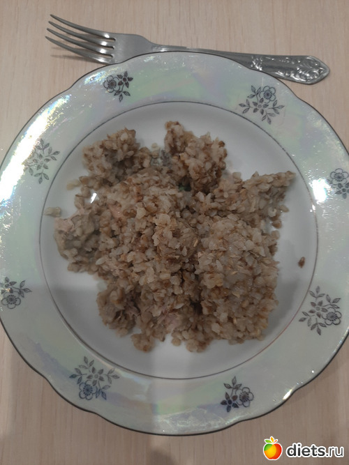 Ужин: гречка с мясом (208 гр) и черный чай с 1 ложкой сахара.