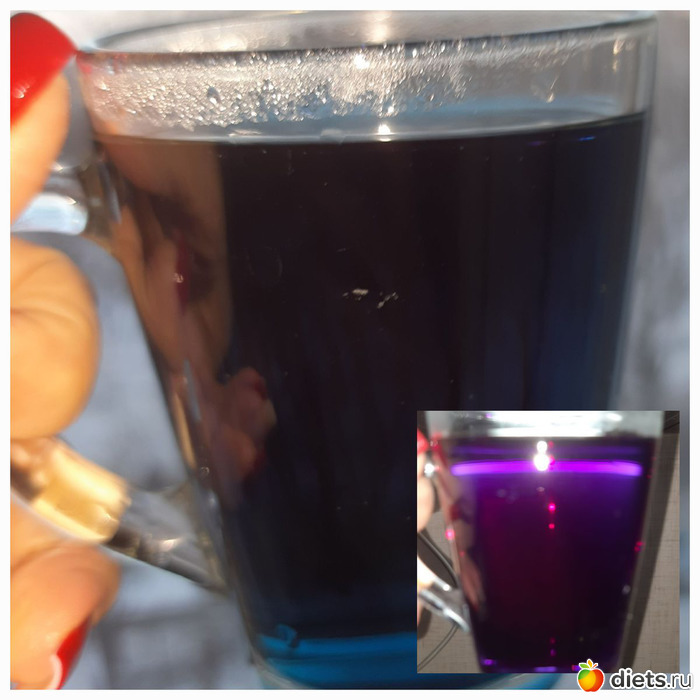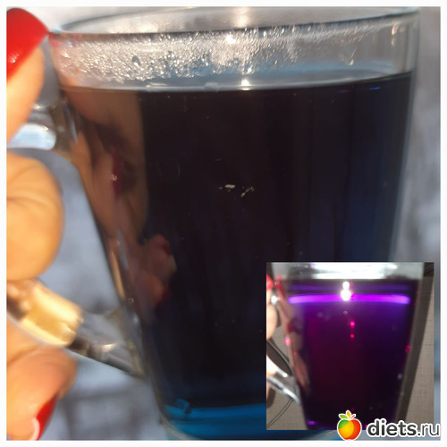 Потом была проба синего чая, мне подарили на НГ. На вид очень необычно, на вкус просто травяной чай. Я посильнее заварила, чтоб эффектно было. Кстати, если в синий чай добавить сок лимона, он станет фиолетовый, мы с сыном экспериментировали.