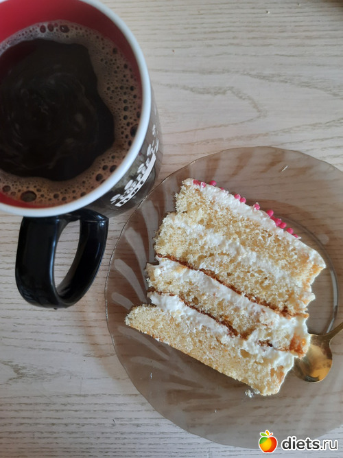 Из перекуса была хурма и кусочек торта с кофе. Пекла новый корж, апельсиновый, надо было снять пробу. У меня нет там чувства вины или еще чего. Я не сижу на диете. Я ем все, но меньше. Поэтому кусочек был маленький